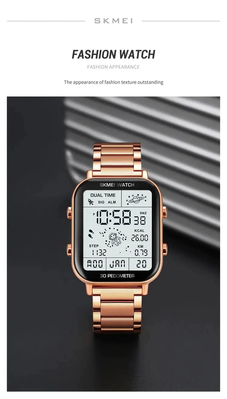 Design Moderno e Versátil 🎨 : Com seu estilo arrojado e sofisticado, este relógio digital é ideal para qualquer ocasião, desde eventos formais até encontros casuais. Os núcleos disponíveis permitem que você escolha o modelo que mais combina com sua personalidade. O Prata e o Ouro trazem um toque de moda, enquanto o Ouro Rose e o Preto oferecem um ar mais contemporâneo.